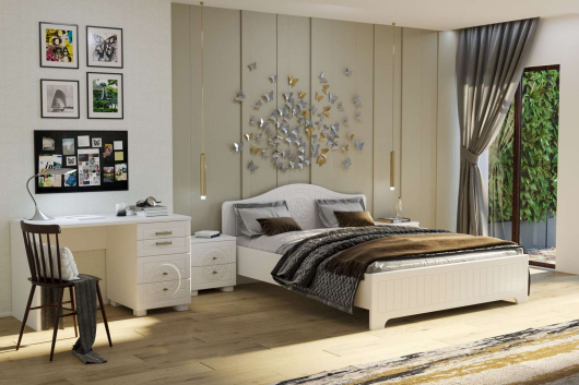 Спальня Монблан (вариант 4) поможет правильно и со вкусом обустроить самую любимую комнату в вашем доме. Широкая кровать с удобным спальным местом позволит отдохнуть и набраться сил после трудных дней, а прикроватные тумбы помогут держать все необходимые и важные предметы около кровати. Письменный стол поможет создать достаточно комфортное место, где вы будете с удовольствием выполнять разнообразные задания. Широкая и удобная столешница позволит разместить на столе стопку документов, канцелярские принадлежности, фотографию любимой семьи и вазу с красивыми цветами. При этом вы будете спокойно работать и ни что вам не помешает. Четыре выдвижных ящика созданы для хранения более ценных и важных предметов.
