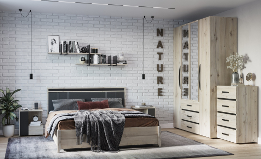 Спальня Nature (вариант 4) поможет создать атмосферу настоящего уюта и комфорта в комнате. Экокожа очень легко чистится и не выгорает под воздействием солнечных лучей. Благодаря оригинальному стилистическому решению и вставкам из экокожи черного цвета, прикроватная тумба смотрится одновременно строго и элегантно. Универсальная конструкция сочетает в себе открытую полку, выдвижной ящик, нишу с дверью на петлях, что очень удобно для хранения вещей, которые так необходимы утром и вечером перед сном. Оптимальная высота прикроватной тумбочки позволит разместить в боковом отделении даже ноутбук. За глухими фасадами скрываются отделения с 4 полочками, регулируемых по высоте, что делает хранение одежды и аксессуаров крайне удобным. Изнутри зеркало покрыто специальной защитной пленкой, которая предотвратит падение осколков, если оно разобьется. Внутри шкафа закреплена стационарная штанга, которая выдержит нагрузку в 40 кг. Особенно деликатные вещи, постельные принадлежности и другие предметы быта помогут хранить три выкатных ящика с глубиной 40 см. Ящики оснащены шариковыми направляющими полного выдвижения, что обеспечит их высокую прочность и абсолютную бесшумность при эксплуатации. Мебель Nature - настоящая находка для ценителей природы, где природная простота и естественность декора объединяются с удобством и практичностью.
