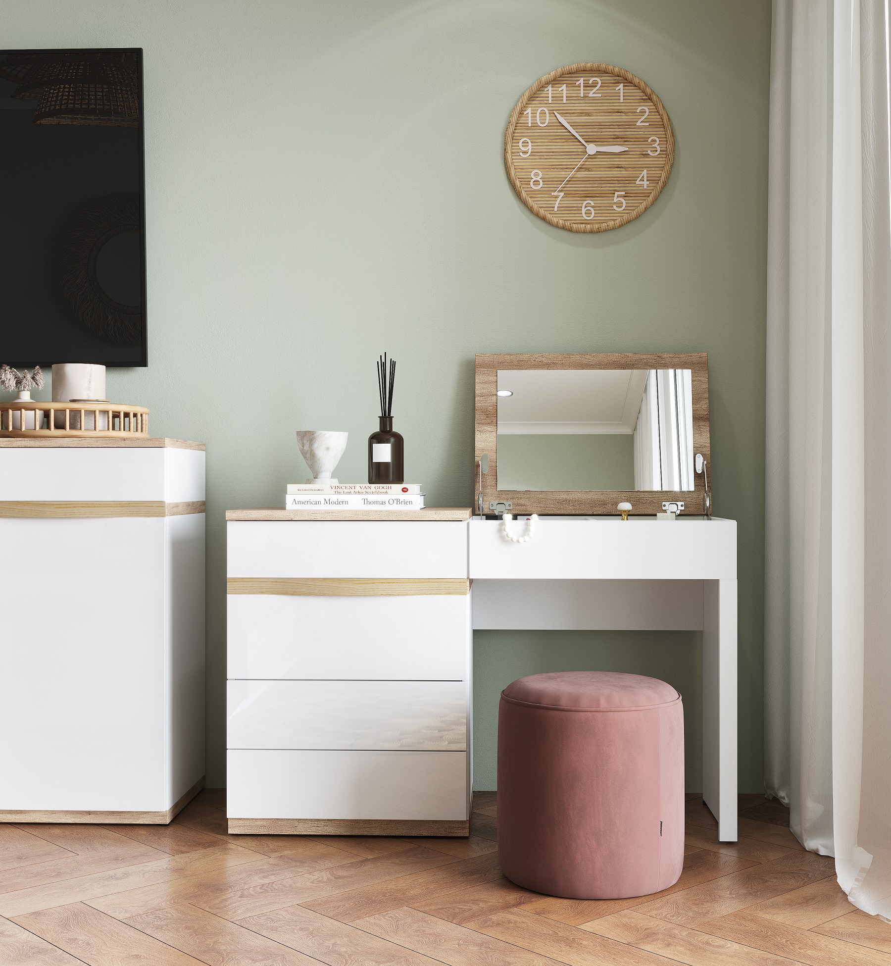 - тумба 03 Николь-Люкс - Ш556 х Г418 х В520 мм.Спальня Николь-Люкс (вариант 4) поможет обустроить уютную, изящную и легкую комнату, где вы сможете отдохнуть не только телом, но и душой. Кровать предоставит необычайно удобное спальное место для расслабления и крепкого сна, а высокое мягкое изголовье позволит комфортно расположиться перед сном и почитать интересную книгу или посмотреть сериал на планшете. Прикроватная тумба позволит держать все необходимое около кровати. Туалетный стол поможет создать уютный и комфортный уголок для наведения красоты и ухода за собой. Подняв столешницу, вы обнаружите зеркало на обратной стороне и пространство, разделенное перегородками для хранения украшений и всевозможных аксессуаров. Отделение с распашной дверкой и два выдвижных ящика предназначены для размещения всей необходимой косметики. Комод предоставит дополнительно место для бережного хранения гардероба. Два вместительных выдвижных ящика и полки, скрытые за распашными дверцами, созданы для размещения одежды, постельного и нижнего белья, а также всевозможных аксессуаров и косметики.
