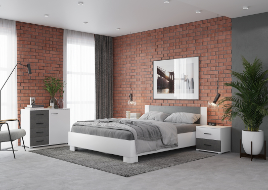 Спальня Nova (вариант 3) сделает вашу комнату по-настоящему комфортной, красивой, наполнит ее атмосферой тепла и уюта, которая способствует полноценному отдыху и расслаблению. Уютная большая кровать с высоким изголовьем поможет отдохнуть, хорошо выспаться и проснуться утром бодрым и полным сил. Две прикроватные тумбы с выдвижными ящиками привлекают внимание и смотрятся гармонично с кроватью, а компактный и необычайно вместительный комод пригодится для хранения одежды, белья и разнообразных аксессуаров.