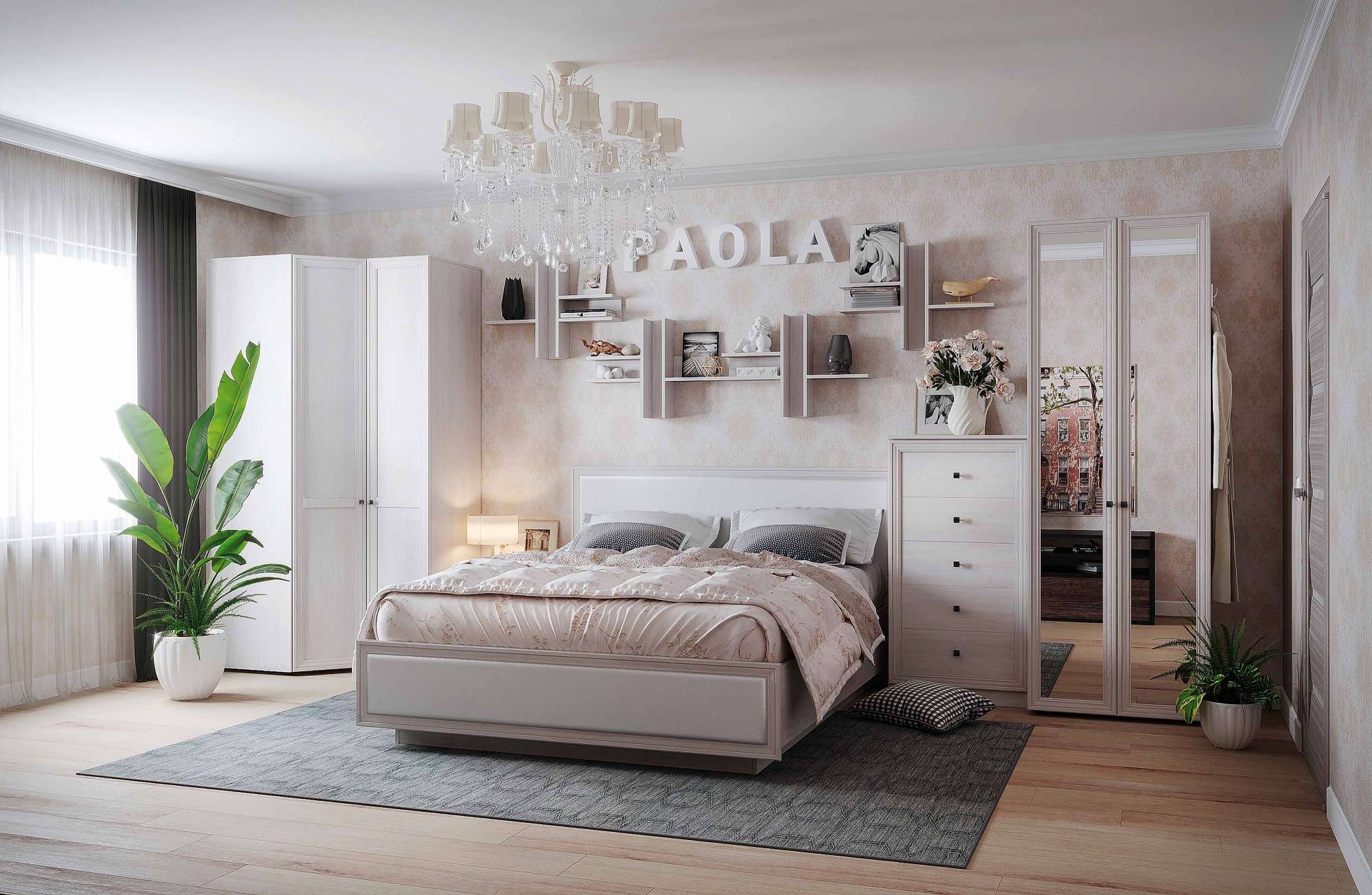 - шкаф для одежды Paola 54 с 2-мя зеркалами - Ш798 x Г585 x В2300 мм.Спальня Paola (вариант 1) позволит создать гармоничный и стильный интерьер, оживить тусклую комнату и придать ей свежести, сделав пребывание более комфортным. Функциональное наполнение шкафов предоставит достаточно места для хранения всего гардероба семейной пары. На прикроватной тумбе вы сможете положить книгу, установить ночник, а в выдвижных ящиках тумбы находится достаточно места для хранения разных мелочей – очки, телефон, пульт от телевизора - откуда они не свалятся случайно. Кровать с подъемным механизмом за счет решения, позволяющего скрыть нижнюю часть основания, будто парит в воздухе. Мягкое изголовье выполнено из экокожи белого цвета и обрамлено рельефным профилем МДФ. В холодные дни экокожа будет дарить тепло и мягкость, а в жаркий день – радовать прохладой. Благодаря газлифтам, кровать поднимается без усилий и обеспечивает доступ к вместительному внутреннему коробу, где вы сможете хранить одеяла, подушки или чемоданы, экономя пространство в спальне и поддерживая аккуратность. А высокие бортики внутреннего короба кровати защитят ваши вещи от попадания пыли. Комод с пятью выдвижными ящиками обеспечит большую зону для хранения одежды и белья. Они оснащены шариковыми направляющими полного выдвижения, благодаря чему вся полезная площадь ящика расходуется рационально, а установить их легко даже для новичка.