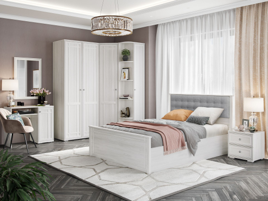 Спальня Ричард (вариант 2) поможет обустроить уютную комнату, где вы сможете отдохнуть не только телом, но и душой. Стол туалетный создан для тех, кто не любит собираться в спешке. Такой стол пригодится для нанесения макияжа и укладки волос. Тумба с дверцей и полками внутри предназначены для хранения всей косметики, аксессуаров и украшений. Кровать предоставит комфортное спальное место где вы сможете отдохнуть, расслабиться и набраться сил. Высокое изголовье позволит расположиться перед сном и почитать интересную книгу, посмотреть фильм или сериал на планшете. Тумба прикроватная поможет разместить около кровати все необходимые предметы. В двух выдвижных ящиках вы сможете хранить книгу для чтения перед сном, маску для сна и крем для увлажнения рук. Сверху на тумбе можно разместить семейную фотографию, небольшой светильник и часы для своевременных подъемов. За распашными дверьми шкафов находятся штанги для вешалок-плечиков с верхней одеждой, деловыми костюмами, красивыми платьями и другой безупречно выглаженной одеждой. Полки пригодятся для хранения сложенной одежды, постельного и нижнего белья, различных аксессуаров.