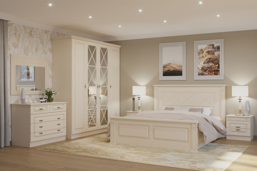 Спальня Стефани характеризуется спокойными цветами, естественной фактурой и лаконичными уютными формами. Она станет достойным украшением вашего дома. Фасады имеют интересный декор, который придаст дизайну изюминку.
