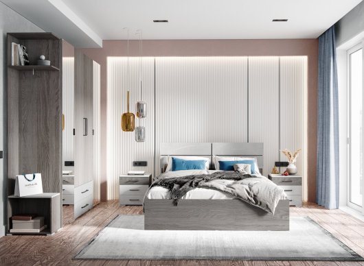 Спальня Теана (вариант 1) поможет обустроить уютную комнату, где вы сможете отдохнуть не только телом, но и душой. Кровать предоставит достаточно комфортное и широкое спальное место, где вы сможете расслабиться, отдохнуть и набраться сил после трудных дней. Высокое изголовье с мягкой вставкой позволит перед сном расположиться и почитать увлекательную книгу или посмотреть интересный фильм. Прикроватные тумбы помогут держать все важные и необходимые предметы около кровати. Комод вместе с зеркалом создают укромный уголок для нанесения макияжа, создания укладок и подбора удачных украшений. За распашными дверьми 2-х дверного шкафа находится широкая штанга для вешалок-плечиков, а два вместительных выдвижных ящика и полки, скрытые в пеналах пригодятся для размещения сложенной одежды, белья и различных аксессуаров.