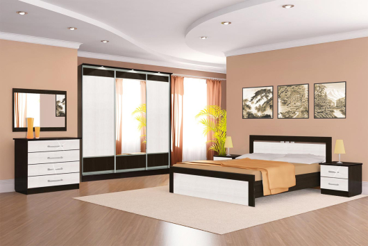 Спальный гарнитур в современном стиле подойдет для любого интерьера. Он включает в себя шкаф, в котором можно разместить весь Ваш гардероб, функциональный комод и кровать с ортопедическим основанием, две прикроватные тумбы и зеркало. -