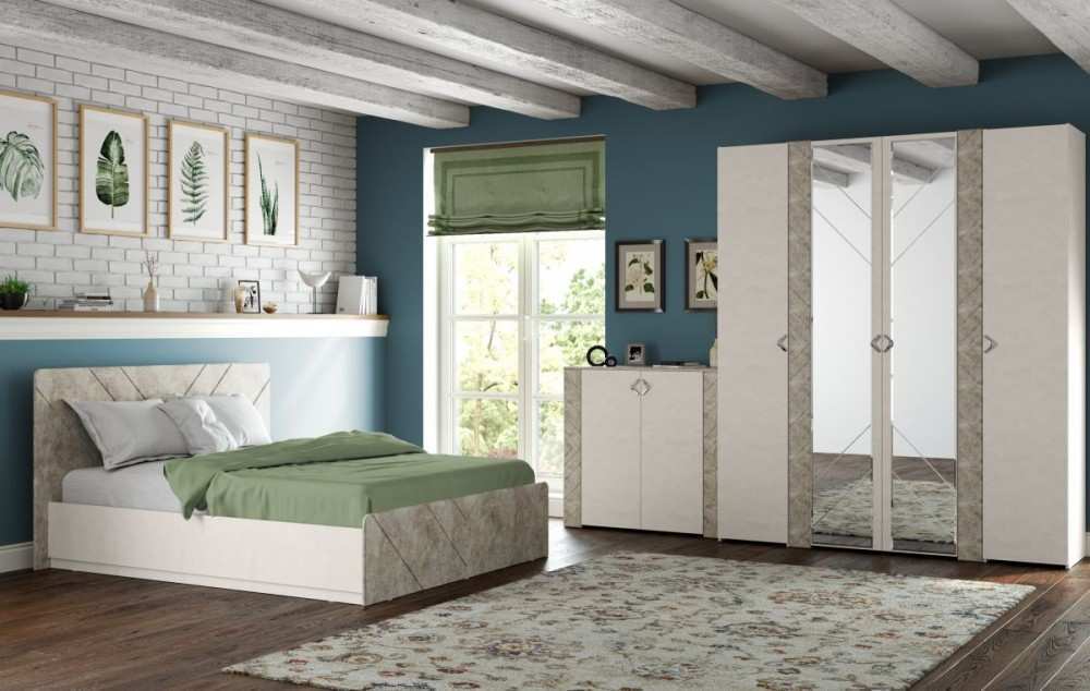 Спальня Амели (вариант 5) поможет правильно и со вкусом обустроить комнату, где вы сможете отдыхать не только телом, но и душой. Прикроватные тумбы позволят держать около кровати все необходимые и важные предметы. Кровать предоставит достаточно удобное спальное место, где вы сможете отдохнуть и набраться сил после трудных и насыщенных дней. Высокая мягкая спинка позволяет перед сном удачно разместиться и почитать интересную книгу или новости на своем гаджете. За распашными дверьми шкафов находится достаточно места для бережного хранения вашего гардероба. Штанги созданы для вешалок-плечиков с красивыми платьями, деловыми костюмами и рубашками, а полки - для сложенной одежды, нижнего и постельного белья, разнообразных аксессуаров. Стол туалетный с ящиком небольшой, но довольно удобный, так как высота стола позволяет беспрепятственно сесть за него. Зеркало выполнено из высококачественного зеркального полотна, за которым вы сможете нанести макияж, создать безупречную прическу или заняться маникюром. Комод с полками вместителен и компактен, он предназначен для постельного белья. Мебель Амели роскошна и сдержанна одновременно, очаровывает спокойной цветовой гаммой с имитацией фактуры шелковой ткани и камня. Фурнитура металлическая хром глянец.