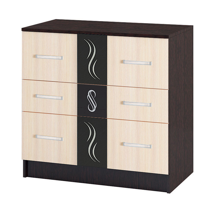 Комод Эрика безупречно впишется в интерьер уютной комнаты. Три широких и достаточно вместительных выдвижных ящиков пригодятся для хранения одежды, постельного и нижнего белья, полотенец, разнообразных аксессуаров, украшений и косметики. Сверху на комоде вы сможете разместить семейные фотографии, вазу или вазон с цветами, сувениры, статуэтки и другие оригинальные предметы декора. Изысканная и оригинальная мебель Эрика декорирована накладками из стекла с зеркальным рисунком, нанесенным методом "шелкография".