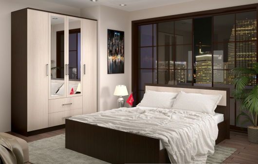 Стандартный спальный гарнитур подойдет как для собственной спальни, так и для номера в гостинице. Эта спальня отвечает самым строгим требованиям любого покупателя. -