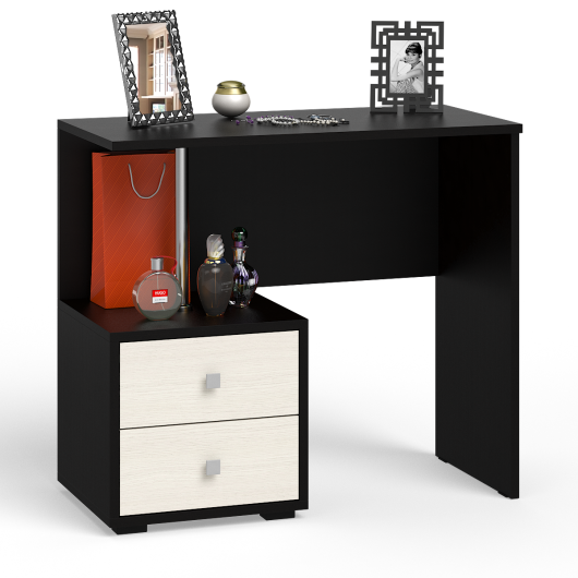 Стол косметический Камелия станет замечательным дополнением для обустройства комфортной и функциональной комнаты. Теперь у вас появится отдельное и достаточно укромное место, где вы сможете спокойно нанести макияж, сделать красивую укладку и подобрать удачные украшения. Тумба с двумя выдвижными ящиками предназначена для хранения всей косметики и мелких аксессуаров. Мебель Камелия привлекает модными дизайнерскими идеями оформления комнаты для отдыха «души и тела», где будет легко и комфортно.