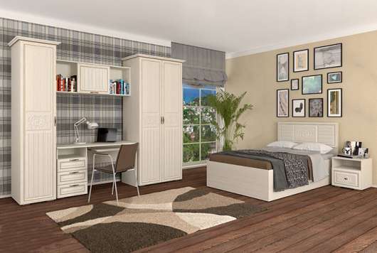 Спальня Виктория 1 поможет создать невероятно уютный интерьер, где вы сможете расслабиться, отдохнуть и набраться сил после трудных и насыщенных дней. Кровать имеет высокую спинку, на которую можно опереться и почитать интересную книгу перед сном, а прикроватный тумбы позволят держать все необходимые предметы около кровати. На тумбах вы сможете разместить светильник, вазу с ароматными цветами, семейную фотографию и будильник для раннего подъема. Стол письменный поможет создать удобное рабочее место. В шкафу имеется полка для вешалок-плечиков и отделение с полками, где вы сможете разместить свой гардероб.