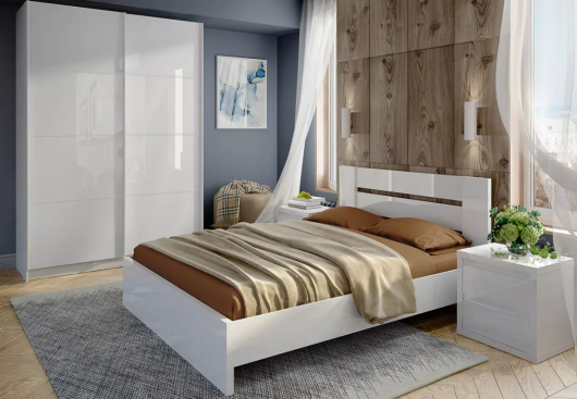 Спальня Норден Норден стильное решение для современного интерьера. Корпус модульной системы из 38 и 16 мм ламинированной древесностружечной плиты производства компании «ЭГГЕР». На лицевые поверхности корпуса нанесено высокоглянцевое лаковое покрытие. Видимые и невидимые части каркасов закромлены кромками ABS и полепропилен.
