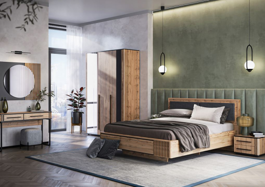 Спальня Аэлита выполнена в древесном цвете в сочетании с черным, станет стильным элементом интерьера. Это сочетание создает контраст, придавая мебели современный и элегантный вид. Древесный цвет добавляет теплоту и уют, а черные акценты подчеркивают форму и детали шкафа.