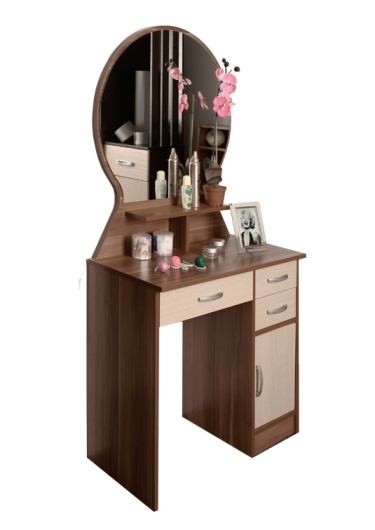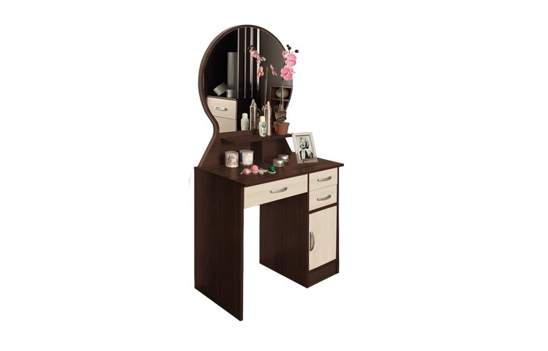 Стол туалетный M-04 выполнен в строгом стиле. Овальное зеркало плавно перетекает в нишу на столике. Под зеркалом установлена полочка для мелочей. Столик имеет пространство для ног, небольшой выдвижной ящик в верхней части и боковой шкафчик с двумя выдвижными ящиками и одним распашным шкафом. Такой туалетный столик идеально подойдет для спальной комнаты. Вы можете хранить в нем не только туалетные принадлежности, но и украсить его рамкой с фотографией Вашей семьи.