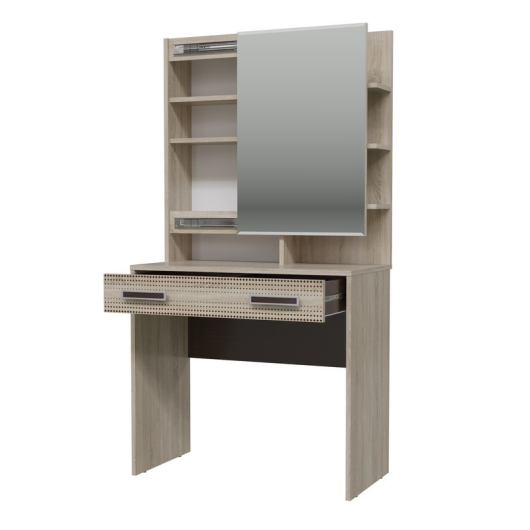 Трюмо Румба 4-2524 поможет создать удобное место для наведения красоты. Теперь вы сможете с комфортом и большим удовольствием нанести макияж и создать безупречную укладку. Открытые полки, широкий выдвижной ящик и пространство, скрытое за зеркалом, предоставят достаточно места для размещения всей косметики, мелких аксессуаров и украшений. Мебель Румба прекрасно сочетает в себе простоту и функциональность.