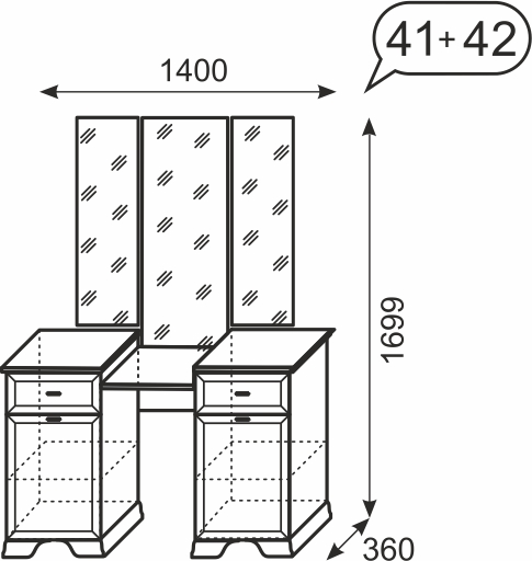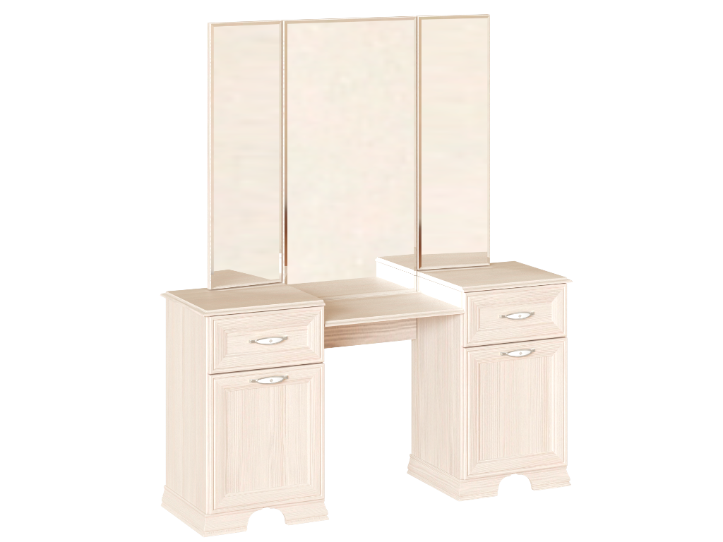 Стол туалетный 42 с трельяжем 41 Венеция станет неотъемлемым элементом в вашей спальне, а также поможет создать уютный и комфортный уголок для наведения красоты и ухода за собой. Две тумба с полками внутри и выдвижные ящики предназначены для размещения всей необходимой косметики.