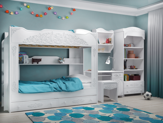 Комбинация материалов — ЛДСП и МДФ — обеспечивает устойчивость к царапинам и долговечность при активном использовании. Банкетка не только служит местом для хранения, но и добавляет мягкости при спуске с верхнего яруса. Навесная полка и открытый пенал организованы так, чтобы ребёнок сам мог доставать нужные вещи, развивая самостоятельность. Габариты столешницы позволяют комфортно работать двоим, если дети разного возраста. При выборе ориентации мебели в комнате учитывайте, что глубина стола и ширина кроватного блока дают гибкость в компоновке — можно разместить у окна или вдоль стены. Светлая палитра «белое дерево» визуально расширяет пространство, особенно в небольших комнатах.