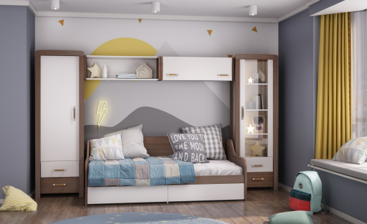 Детская Bartolo (вариант 3) поможет со вкусом обустроить уютную и необычайно комфортную комнату для вашего ребенка. Открытые полки пригодятся для размещения заслуженных наград и кубков, ярких фотографий, любимых игрушек, интересных книг и различных сувениров. За распашной дверью глухого шкафа находятся полки, созданные для сложенной одежды, белья и различных аксессуаров. Два небольших, но вместительных выдвижных ящика созданы для мелких аксессуаров и других важных для ребенка предметов. Достаточно комфортное и широкое спальное место предоставит возможность расслабиться, отдохнуть и набраться сил после насыщенных дней. Вместительные выдвижные ящики предназначены для хранения игрушек и постельного белья.