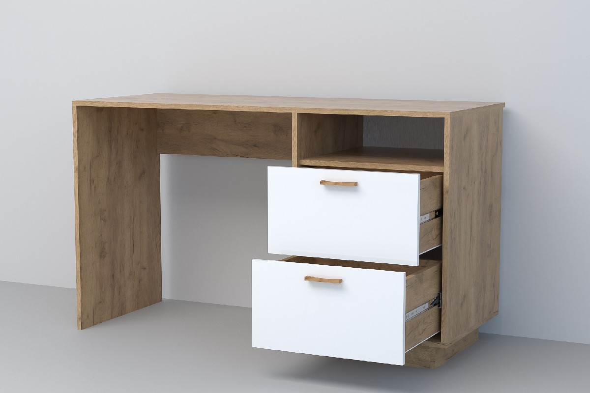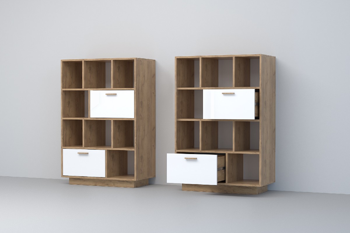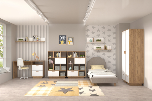 Комбинация подиумных модулей создаёт ощущение пространства — особенно удобно в маленьких комнатах. Столы и полки на одном уровне с комодами позволяют ребёнку легко доставать вещи без помощи взрослых. Два комода дают возможность разделить зоны: один — для одежды, второй — для книг, канцелярии или игрушек. Полки над комодами отлично подойдут для хранения обложек, значков или коллекций. Шкаф с внутренней штангой и выдвижными ящиками справится с гардеробом на сезон вперёд. Мебель собрана на надёжных опорах — легко перемещается при уборке. Под кроватью — свободное место для хранения коробок или игрушек. Все поверхности гладкие, без выступов — безопасно при активных играх.