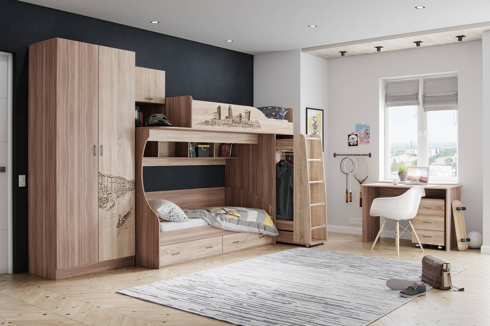 Детская Орион (вариант 5) поможет обустроить функциональную и достаточно комфортную комнату для ваших детей. За распашными дверьми шкафа находится вместительное пространство, созданное для хранения гардероба. Две штанги, расположенные на разной высоте, предназначены для вешалок-плечиков со школьными костюмами и красивыми платьями, а полки - для белья, аксессуаров и коробок с обувью. Кровати позволят расслабиться, отдохнуть и набраться сил для новых свершений, а выдвижные ящики пригодятся для хранения игрушек и размещения постельного белья. Стол вместе с тумбой на колесиках и комодом помогут обустроить рабочее место, где ребенок будет с удовольствием выполнять домашнее задание. Классические цвета исполнения прекрасно сочетаются с дизайнерскими изображениями городов мира, нанесенными на фасады методом цветной фотопечати.