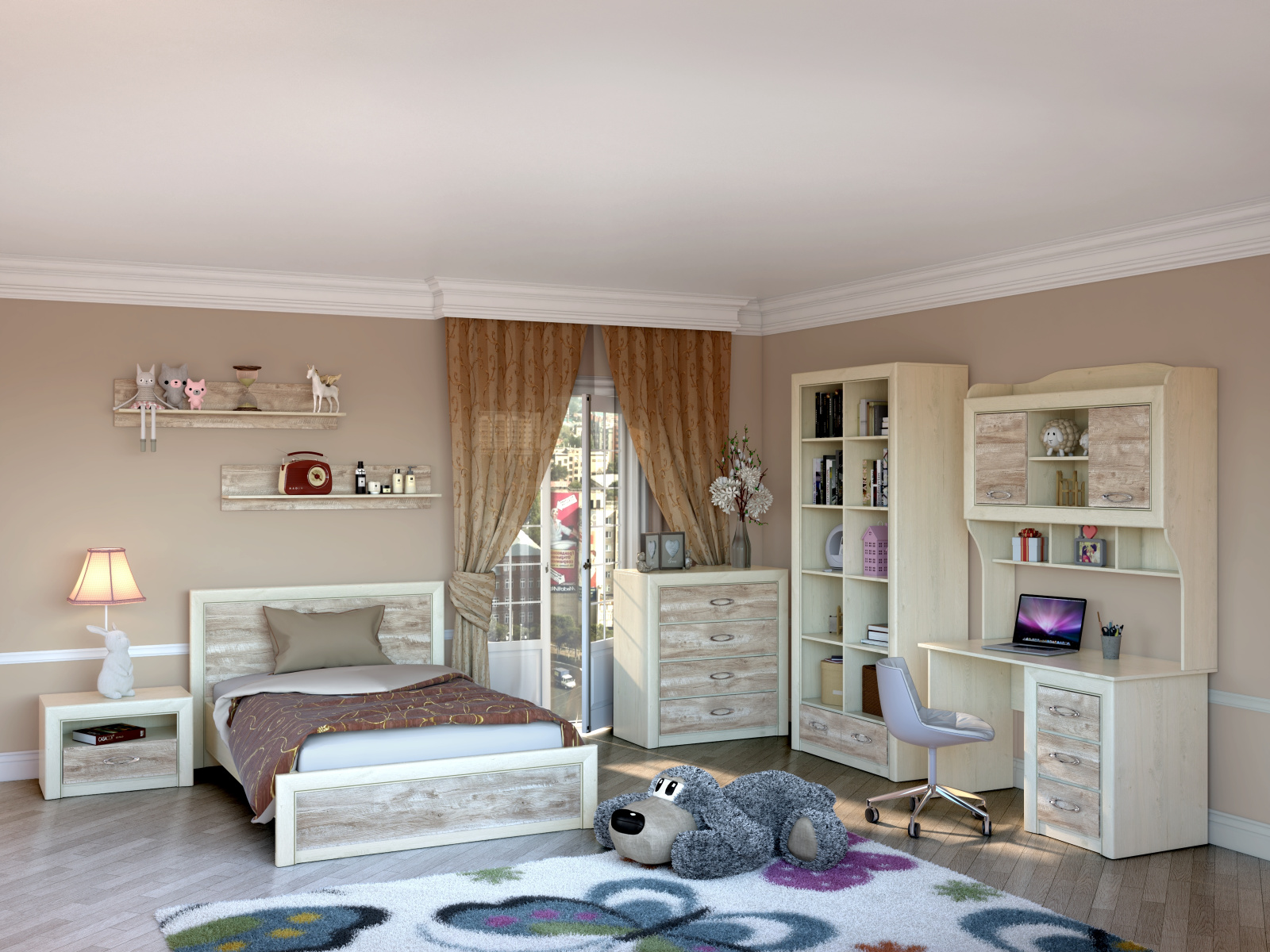Детская Мартина (вариант 2) поможет обустроить достаточно уютную комнату для проживания вашего ребенка. На открытых полках будут гармонично смотреться семейные фотографии, любимые детские игрушки, интересные книги, небольшие вазоны с цветами, памятные сувениры, необычные статуэтки и оригинальные предметы декора. Стол вместе с надстройкой помогут создать и обустроить необычайно комфортное место, где ребенок будет с удовольствием выполнять домашние задания и заниматься саморазвитием. Широкая столешница позволит расположить все необходимое под рукой и при этом спокойно делать записи или читать книгу. Выдвижные ящики предназначены для размещения разнообразных канцелярских и школьных принадлежностей. Кровать предоставит необычайно удобное спальное место, где вы после трудных и насыщенных дней сможете расслабиться, отдохнуть и набраться сил. Выдвижные ящики комода пригодятся для размещения сложенной одежды, постельного и нижнего белья, различных аксессуаров и коробок с обувью. Мебель Мартина отличается сочетанием светлых оттенков, изысканной фурнитурой, древесным декором фасадов, которое создаст неповторимую эстетику в вашем доме.