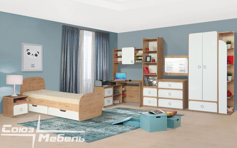 - стеллаж №8 Скай - Ш300 х Г520 х В2080 мм.Детская Скай (вариант 3) поможет со вкусом обустроить уютный и функциональный интерьер детской комнаты. Большое количество открытых полочках предоставят возможность разместить любимые игрушки, заслуженные грамоты и медали, а также различные оригинальные предметы декора. Стол компьютерный вместе с надстройкой помогут обустроить удобное и достаточно функциональное рабочее место для вашего ребенка. Сидя за таким столом, ребенок будет с удовольствием работать над домашними заданиями. Широкая столешница позволит разместить все необходимое под рукой и спокойно делать записи в тетради или читать учебник. Вместительные выдвижные ящики и полки в надстройке пригодятся для аккуратного хранения разнообразных школьных и канцелярских принадлежностей. За распашными дверьми шкафа находится широкая штанга для вешалок-плечиков со школьной формой, различными костюмами и другой безупречно выглаженной одеждой. Антресольная полка и вместительный выдвижной ящик пригодятся для размещения белья, различных аксессуаров и коробок с обувью. Кровать предоставит комфортное спальное место с основанием, которое поможет ребенку после насыщенного дня расслабиться, отдохнуть и набраться сил. Два вместительных выдвижных ящика созданы для размещения и хранения постельного белья и большого количества игрушек. Компактное изделие предоставит ребенку возможность держать около кровати все необходимые и важные предметы. Небольшой выдвижной ящик и открытая ниша пригодятся для размещения интересной книги для чтения перед сном, личного дневника для записей или какой-нибудь игрушки. Сверху на тумбе можно расположить светильник, часы для своевременного подъема и оригинальную статуэтку.