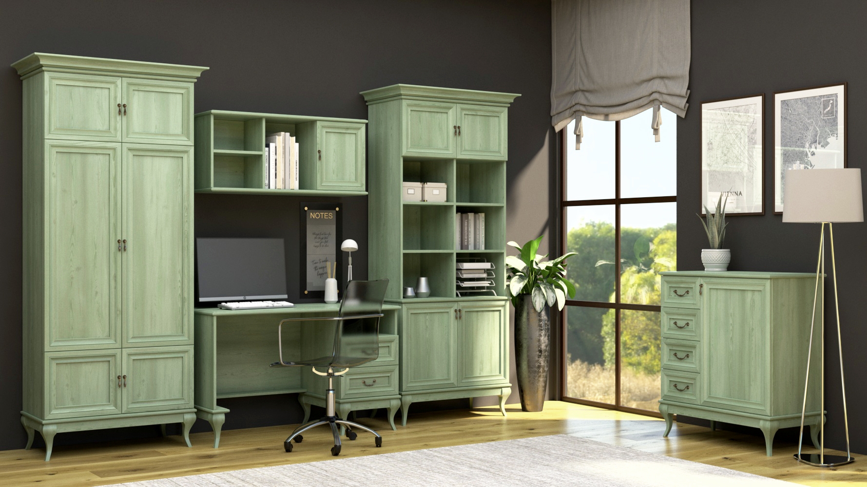 Функциональная и современная мебель - это именно то, что ищут заботливые родители для своих любимых детей. Данный набор поможет создать уютную атмосферу в комнате, а также предоставит множество места для хранения разнообразных вещей. Высокий шкаф с комодом помогут разместить одежду и белье, а стол вместе с навесной полкой создают комфортное место для учебы.