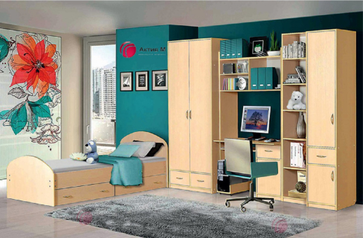 Набор для детской комнаты: стол рабочий, каркас кровати (900 х 2000 мм) с ящиками, шкаф для платья, шкаф для белья, стеллаж.