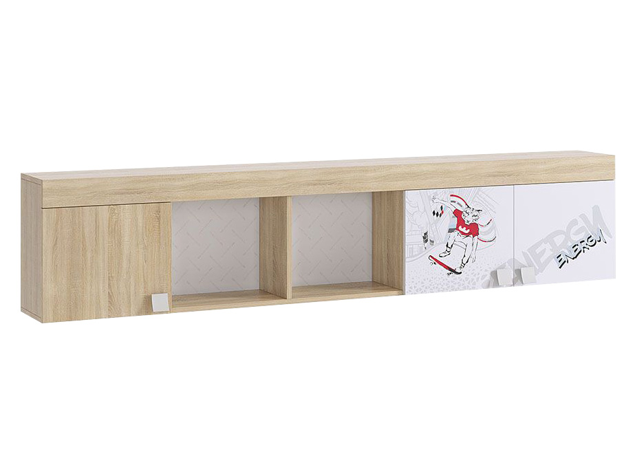 Полка Энерджи станет отличным дополнением общего интерьера комнаты, а также поможет создать уютную атмосферу. Открытые полки пригодятся для размещения интересных книг, ярких фотографий, сувениров и оригинальных статуэток, а также других предметов, которые хотелось бы видеть постоянно. Отделения с глухими дверками можно использовать для хранения сложенной одежды и других вещей.