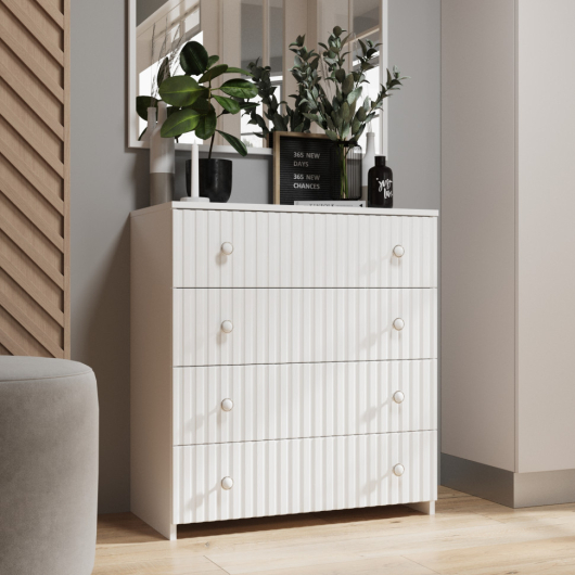 Комод 4 с изящным дизайном станет стильным украшением вашего дома. Необычный декор фасадов придаст изюминку интерьеру. Корпус в древесных тонах или белом цвете гармонично сочетается со стильным декором фасадов. -