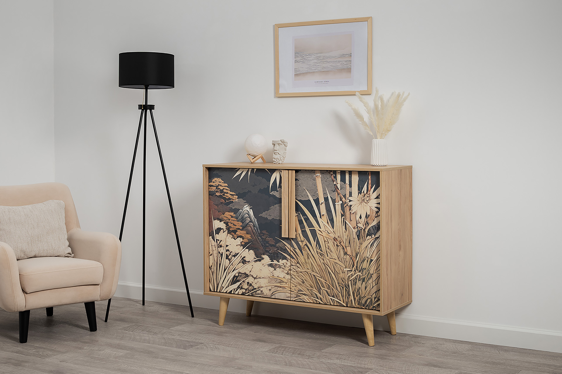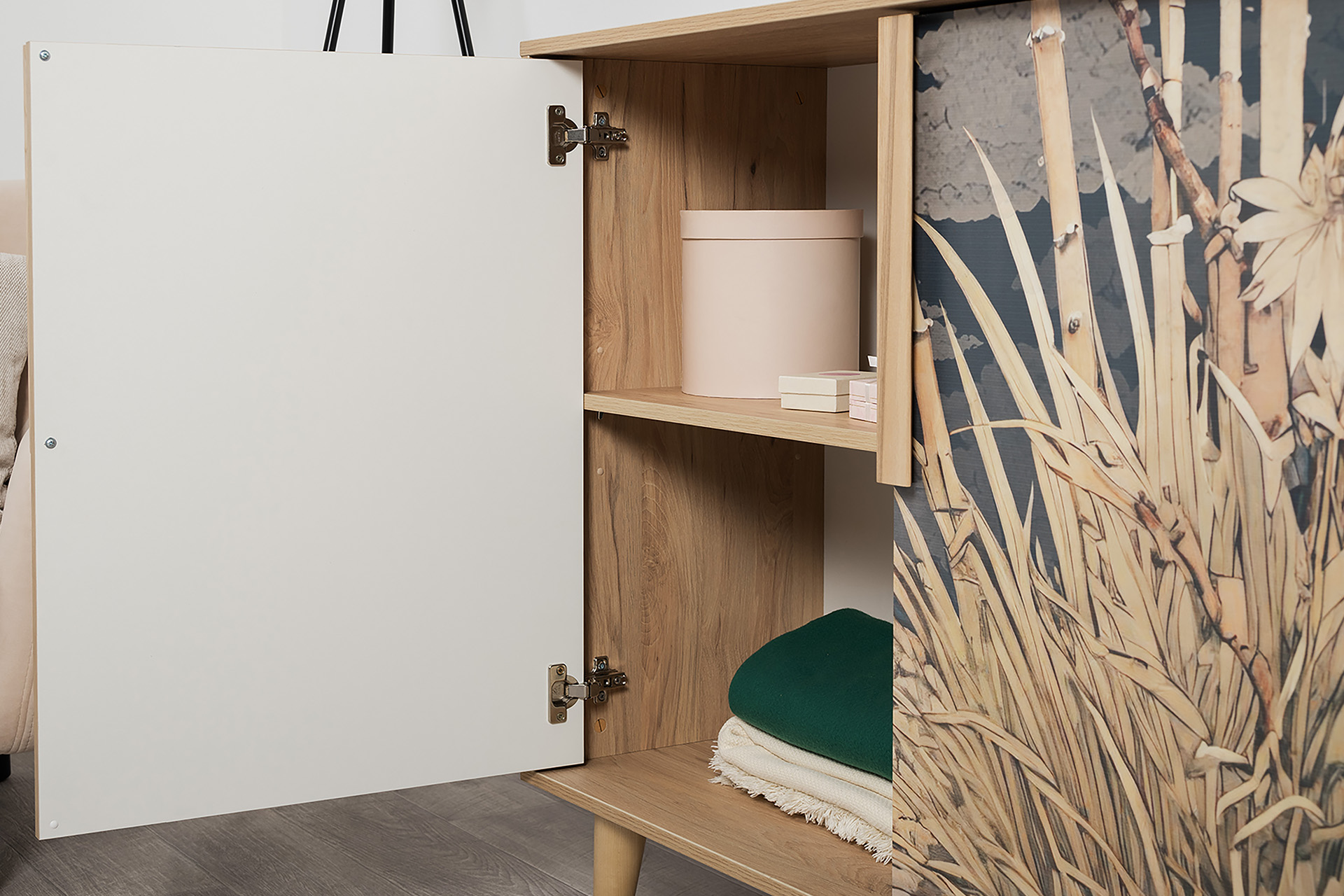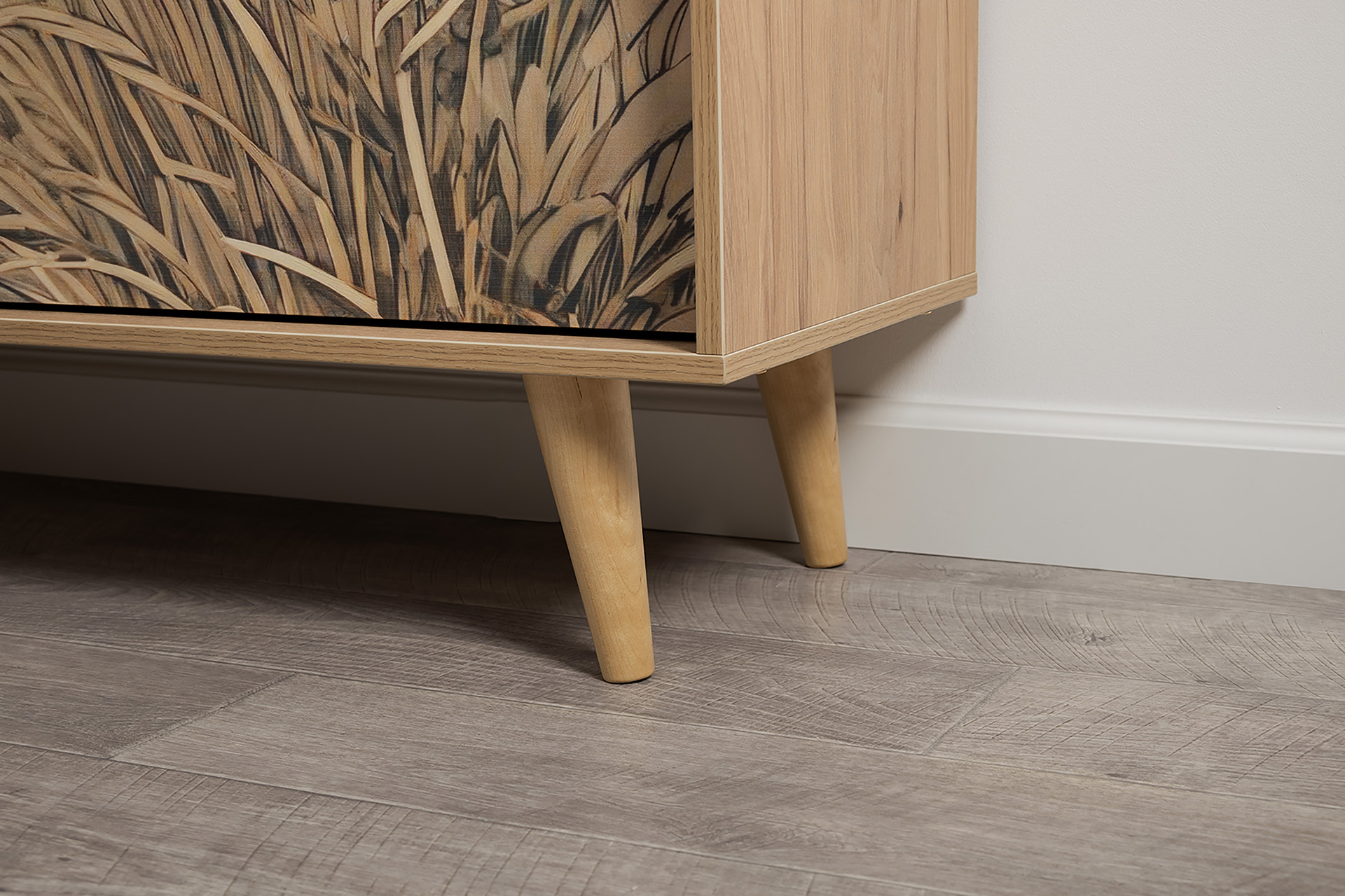 Комод Току 16.230.04 - стильная и современная модель с растительным принтом на фасаде. Ручки и опоры из массива дерева. Вместительные отделения со съемными регулируемыми полками обеспечивают удобное хранение, а углубленные фасады придают конструкции стильную глубину. -