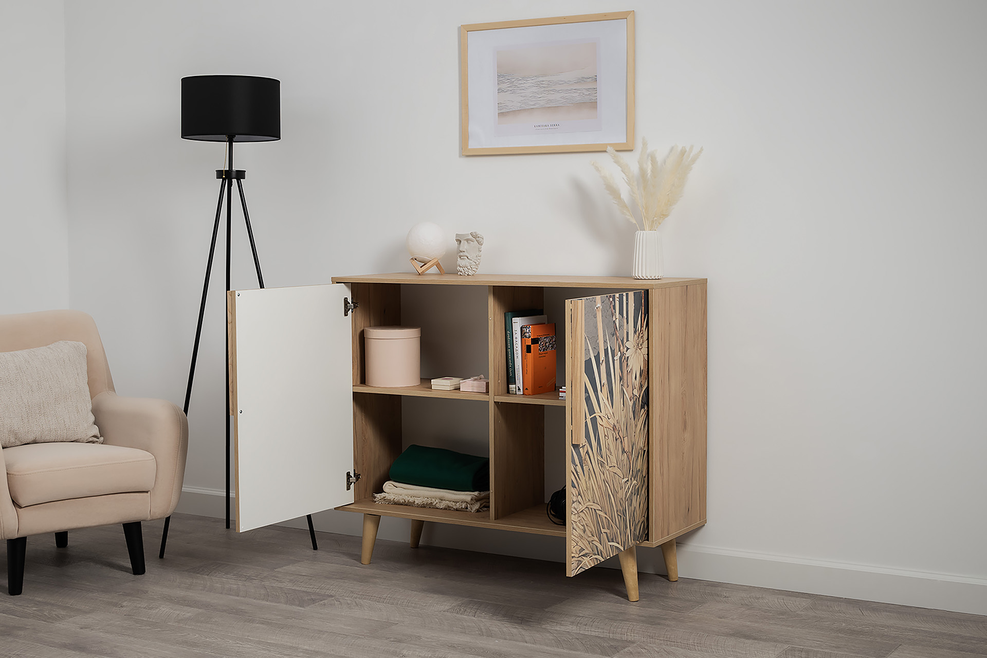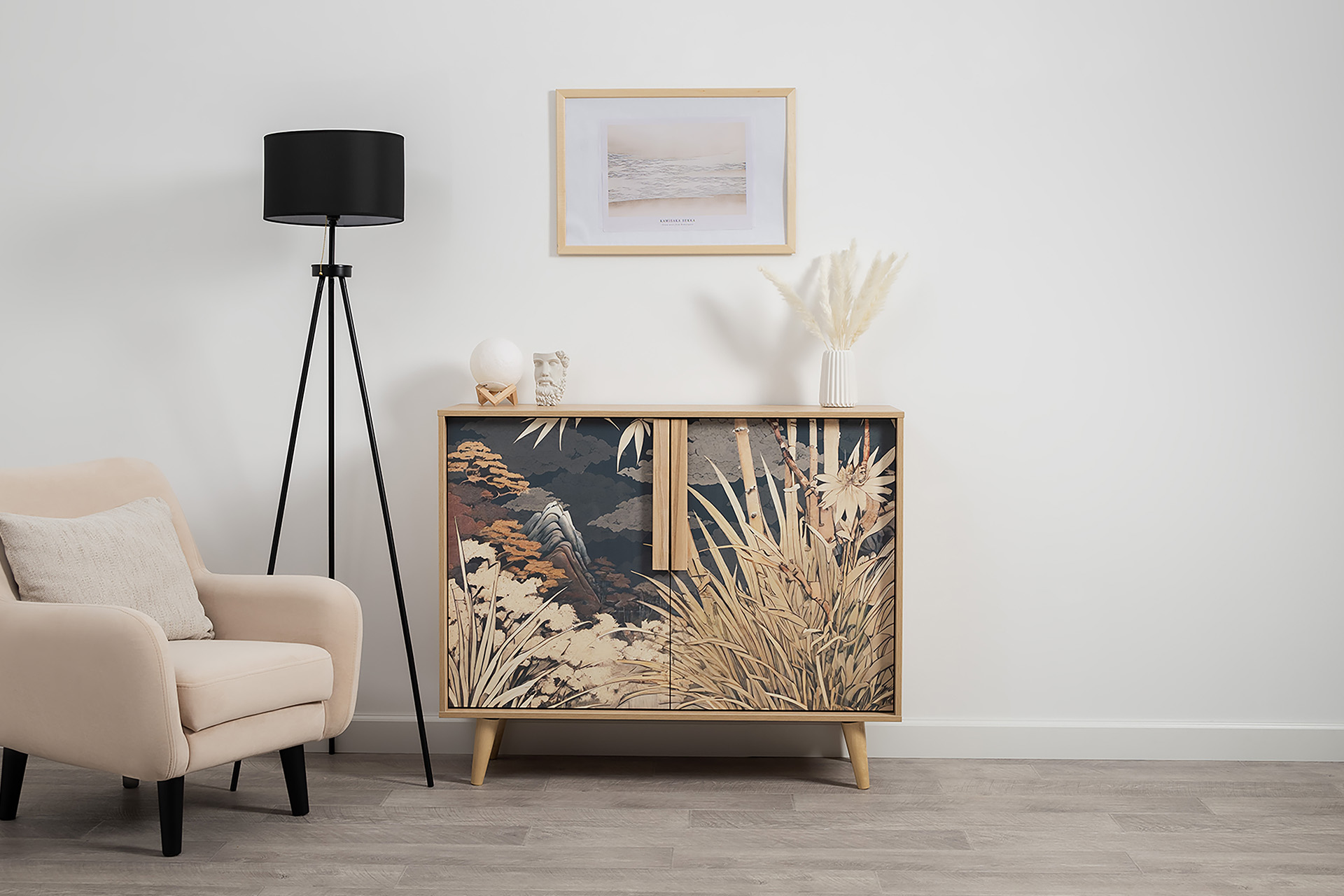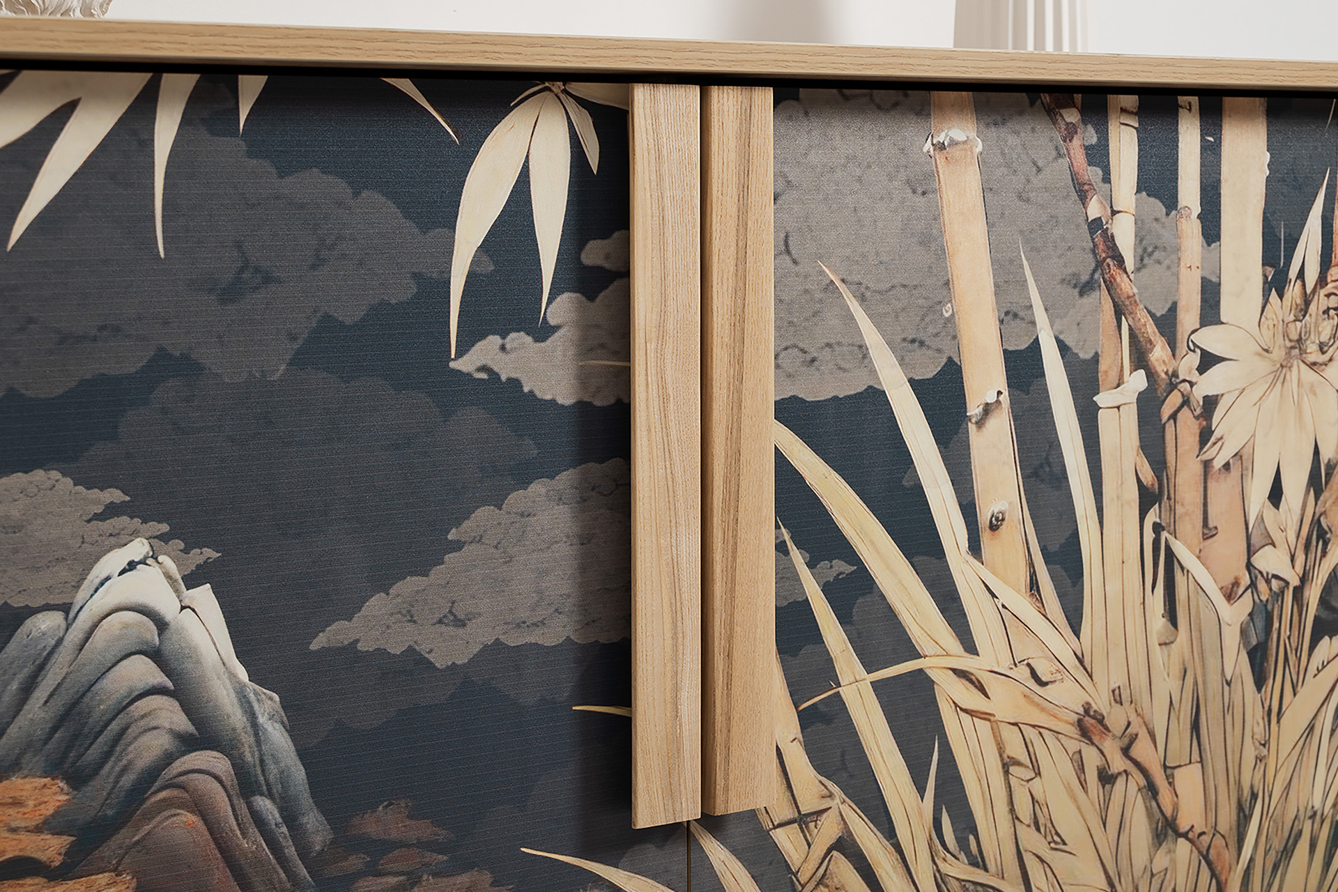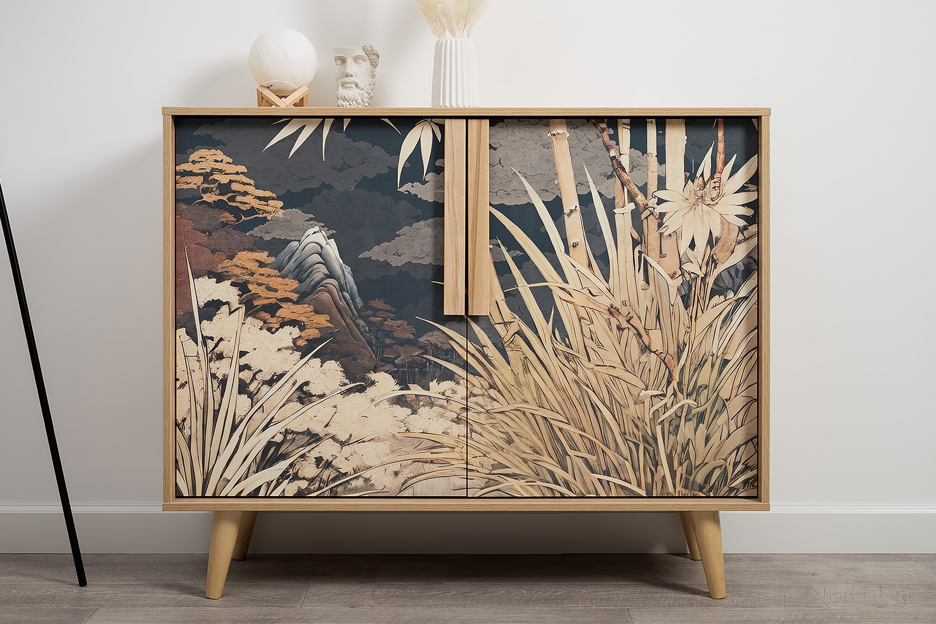 Комод Току 16.230.04 - стильная и современная модель с растительным принтом на фасаде. Ручки и опоры из массива дерева. Вместительные отделения со съемными регулируемыми полками обеспечивают удобное хранение, а углубленные фасады придают конструкции стильную глубину. -