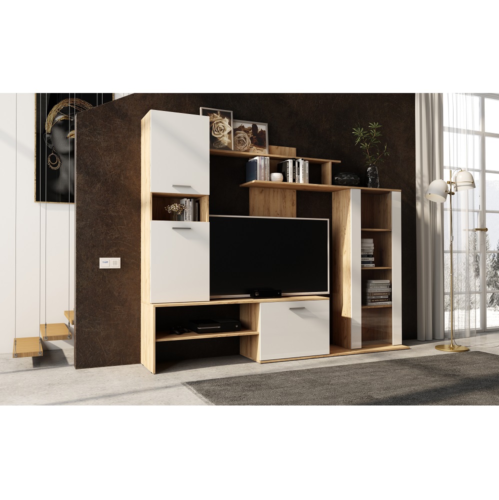 Стенка Данко станет отличным выбором для гостиной. Сочетание светлого дерева с белым глянцем впишется в сканди и современный дизайн комнаты. Наличие полок и ниша под ТВ поможет разместить книги, вещи, аксессуары и телевизор.