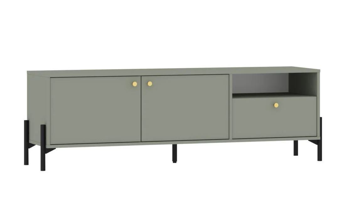 Тумба под ТВ Нуар НМ 011.35 из коллекции Нуар цвета Хаки подойдет для тех, кто ищет необычный современный дизайн. Это слияние двух стилей – строгая геометрия линий придает сдержанности и минимализма, а изящные формы добавляют классического благородства. Круглые ручки золотого цвета подчеркивают уникальность стиля коллекции.