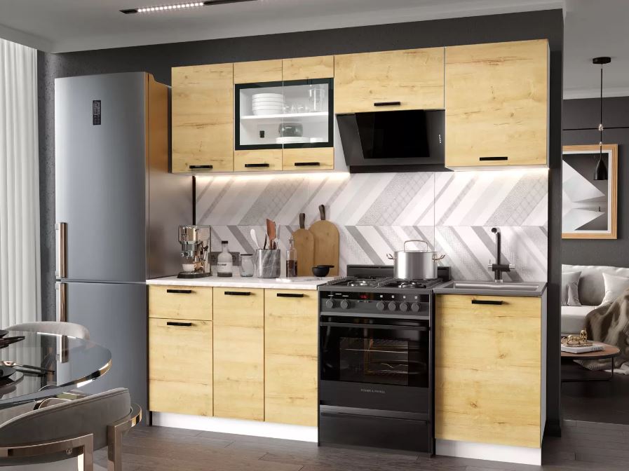 Кухонный гарнитур Хозяюшка 2,1 м выполнен в светлых природных оттенках и дополнен контрастными ручками. Такой дизайн отлично смотрится в современных интерьерах и наполняет пространство атмосферой уюта. Вместительные модули помогут удобно расставить посуду, бытовую технику и кухонную утварь.