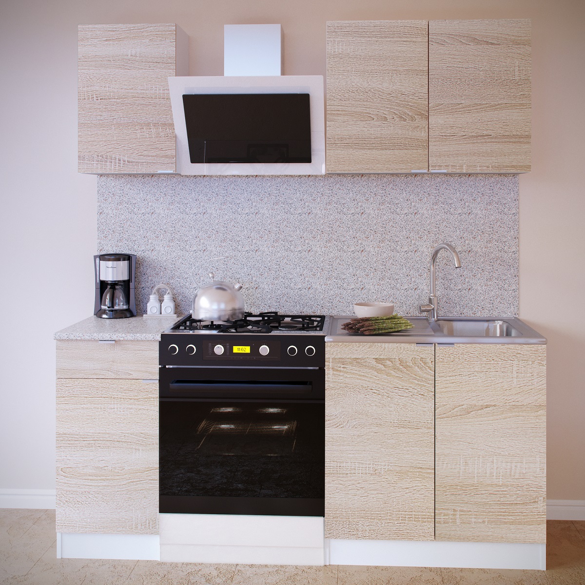 Кухонный гарнитур для маленькой кухни. В комплекте есть все необходимые модули для хранения посуды, столовых приборов и аксессуаров для готовки.
