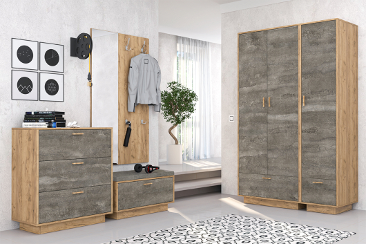 - пенал П-1 Эго опора подиум - Ш418 х Г510 х В1974 мм.Прихожая Эго (вариант 7) поможет обустроить достаточно функциональное и теплое помещение, которое с порога будет приветствовать вас. Крючки на вешалке и штанга в шкафу предназначены для размещения верхней одежды. Отделение, скрытое за откидной дверкой тумбы, позволяет разместить обувь. Мягкое сиденье пригодится для комфортного снятия обуви. За распашными дверьми находится широкая штанга для вешалок-плечиков с одеждой, а выдвижные ящики и полки в пенале пригодятся для бережного хранения сложенной одежды, различных аксессуаров и коробок с обувью.
