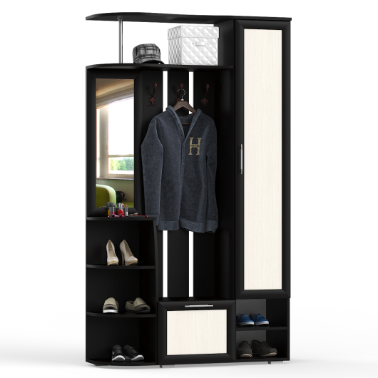 Прихожая Ксения-2 поможет со вкусом обустроить уютный и достаточно функциональный коридор. Изделие состоит из шкафа-пенала, открытой вешалки, стеллажа, тумбы для обуви и зеркальной панели. Небольшая глубина прихожей позволяет размещать мебель даже в небольшое помещение. Открытая вешалка оборудована тремя трёхрожковыми крючками и антресольной полкой. На открытых полках стеллажа будут гармонично смотреться оригинальные предметы декора. Шкаф-пенал имеет нижнюю открытую часть с одной полочкой и верхнюю часть с распашной дверкой и тремя полочками внутри.