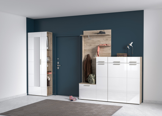 - комод Лайн 13.121 - Ш900 х Г350 х В1292 мм.Прихожая Лайн (вариант 3) поможет создать приветливую и благоприятную атмосферу, которая с порога будет окутывать теплом. Штанга и крючки на вешалке созданы для размещения верхней одежды, головных уборов и разнообразных аксессуаров. Небольшая тумба пригодятся для бережного хранения обуви. Выдвижной ящик и полочка предоставят место для различных флаконов, тюбиков и других мелочей. За распашной дверцей шкафа находится выдвижная штанга для вешалок-плечиков с верхней одеждой и антресольная полка для головных уборов и разнообразных аксессуаров. Нижняя полка пригодится для размещения и бережного хранения нескольких пар обуви. Комод оснащен полками, скрытыми за двумя распашными дверьми, и двумя выдвижными ящикам. Сверху на комоде можно разместить несколько семейных фотографий, вазу с цветами, косметику и украшения. Стеллаж предоставит дополнительное место для размещения семейных фотографий, необычных статуэток, оригинальных декоративных предметов и многого другого.