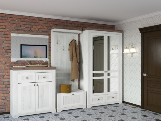 - шкаф 2-х створчатый Ривьера с зеркалами - Ш1219 х Г478 x В2150 мм.Прихожая Ривьера (вариант 2) поможет обустроить достаточно функциональное и теплое помещение, которое с порога будет приветствовать вас. Четыре крючка на вешалке и штанга в шкафу предназначены для размещения верхней одежды, а антресольная полка за распашной дверью пенала пригодится для головных уборов и других сезонных аксессуаров. За дверками тумб можно разместить обувь всей семьи или использовать пространство для хранения косметики по уходу за обувью, различных аксессуаров и других мелких предметов. Поверхность маленькой тумбы пригодится в качестве сиденья для комфортного надевания или снятия обуви. Мебель Ривьера - это сочетание простых форм со спокойными, фактурными оттенками, которые создают гармонию и лаконичность дизайна.
