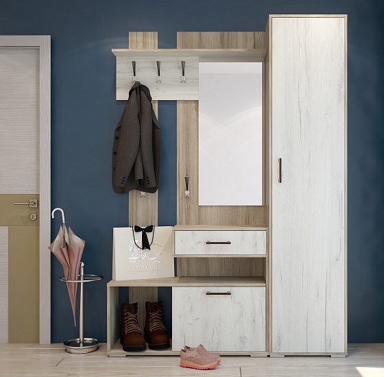 - шкаф Смарт - Ш482 х Г350 х В2116 мм.Компактная и необычайно вместительная прихожая Смарт поможет создать комфортную и весьма приветливую атмосферу. Заходя в дом, вас будет встречать прихожая, наполненная уютом и теплом. Модель имеет открытую вешалку с тремя крючками для одежды и двумя крючками пониже для сумок и аксессуаров. Антресольная полка пригодится для шапок, шарфов, шляпок или зонтов. Тумба для обуви оборудована открытым отсеком и откидной секцией с полкой для бережного и аккуратного хранения любой сезонной обуви, также имеется выдвижной ящик для ключей, перчаток и других мелочей, и открытая полка, на которую можно присесть и надеть обувь, или положить сумку или барсетку. Небольшое зеркало украсит интерьер и позволит перед выходом из дома убедиться, что вы выглядите превосходно. Вместительный и небольшой шкаф Смарт пригодится для размещения одежды, обуви и всевозможных аксессуаров.