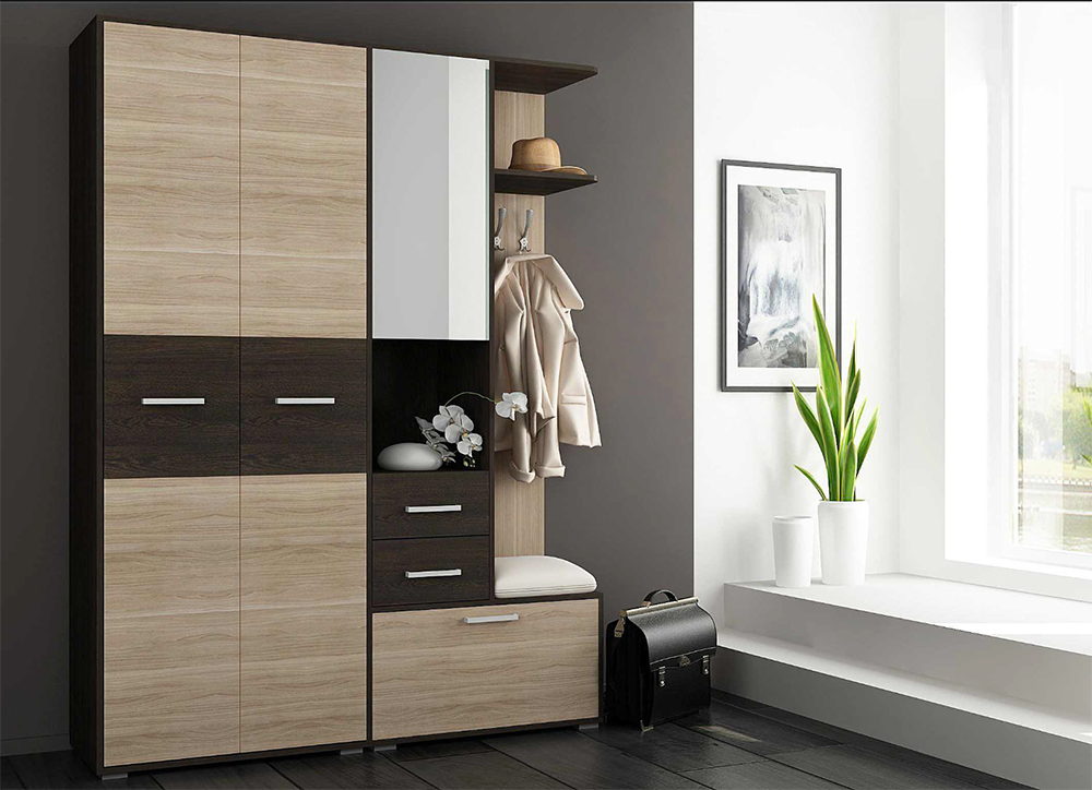 Компактная и необычайно вместительная прихожая Танго 2 поможет создать комфортную и весьма приветливую атмосферу. Заходя в дом, вас будет встречать прихожая, наполненная уютом и теплом. Модель имеет секцию с антресольной полкой и штангой для одежды, а за небольшой дверкой с зеркалом расположены две полки, два выдвижных ящика и снизу секция с откидной дверкой. Открытая часть оборудована мягким местом для комфортной примерки обуви, крючки созданы для верхней одежды и полка пригодится для шляп, шарфов и других аксессуаров.