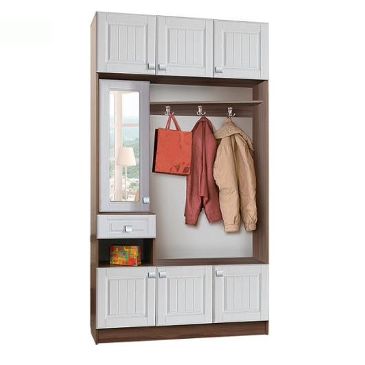 Прихожая Вега-3 сочетает в себе стиль, комфорт и практичность. Можно комплектовать с элементами модульной системы прихожей Вега. Фасады выполнены из МДФ с фрезеровкой. Корпус – ламинированная ДСП. В нише располагаются зеркало и открытая вешалка для верхней одежды. Также включает в себя выдвижной ящик, нижний и верхний шкаф с двумя распашными дверями. -