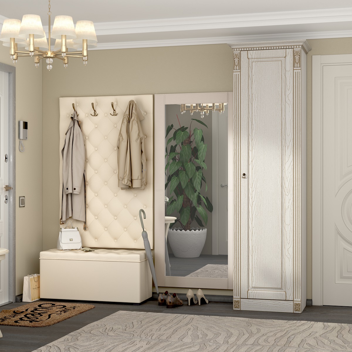 Прихожая Вероника (вариант 8) поможет правильно и со вкусом обустроить самое приветливое помещение в вашем доме. Входя в дом, вы сможете ощутить то тепло и уют, которых так не хватает на протяжении всего дня. Роскошная вешалка с тремя двойными крючками создана для размещения верхней одежды и зонтов. Антресольная полка с бортиком и вместительные шкафы созданы для головных уборов, шарфов и всевозможных аксессуаров. Банкетка с мягким сиденьем поможет спокойно надеть или снять пару обуви. Небольшая тумба пригодится для хранения необходимой косметики, а зеркало с полками внутри перед выходом из дома убедит вас в том, что выглядите вы неотразимо.