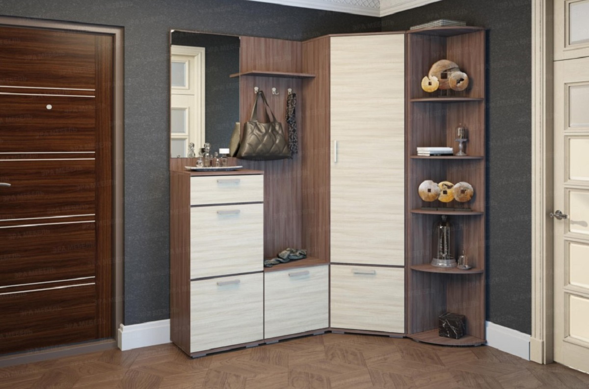 - Вешалка-пенал угловая Ш354 х Г354 х В2032 ммЭта прихожая — не просто мебель, а решение для узких проходов и небольших пространств. Угловые модули эффективно используют каждый сантиметр, а зазор между тумбами и дверью позволяет легко открывать её без помех. Зеркало не только помогает собрать образ перед выходом, но и визуально расширяет пространство. Вешалка-пенал с внутренней полкой — идеально для ключей, очков и мелочей. Высокая тумба под обувь вмещает пару на сезон, а малая — удобна для временного хранения. Сборка простая, без лишнего инструментария — справитесь за вечер. Подходит для типовых коридоров, где важно совместить функциональность и аккуратный вид.