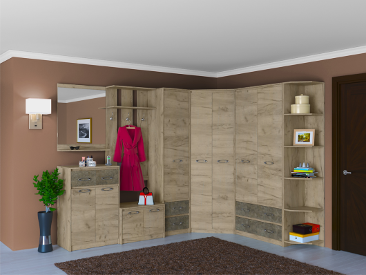 Прихожая отлично впишется в узкие или угловые коридоры — её конструкция использует пространство по диагонали, не загораживая проход. Открытые полки стеллажа легко превратить в мини-выставку: разместите ключи, фонарик, зонт и даже термос с чаем — всё под рукой, но без суеты. Выдвижные ящики и внутренние полки в шкафах помогут разделить сезонную одежду: зимой — пальто и шарфы, летом — лёгкие куртки и сумки. Тумба для обуви с отсеками по размеру семьи избавит от хаоса у входа. А зеркало с полкой — не просто элемент декора: удобно накладывать макияж перед выходом или поправить прическу. Подходит для квартир-студий и домов с небольшим коридором — компактность без потери функциональности.
