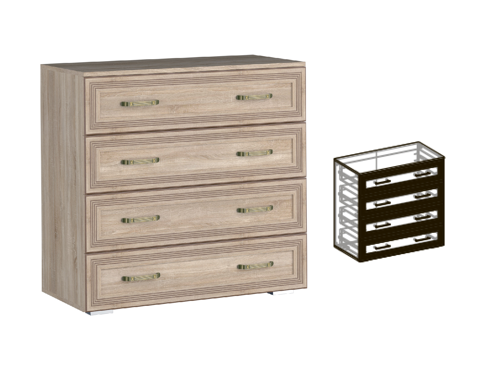 Комод Бруно станет отличным дополнением интерьера уютной комнаты. Четыре необычайно вместительных выдвижных ящиков предназначены для аккуратного хранения одежды, постельного и нижнего белья, различных аксессуаров, украшений и косметики, полотенец и многого другого. Сверху на комоде будут прекрасно смотреться несколько фотографий, памятные сувениры и оригинальные предметы декора.