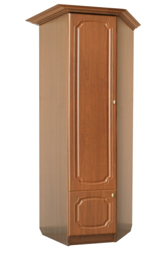 Угловой шкаф в классическом стиле является модулем для гостиной Диана. Он имеет за глухой дверью четыре полки и длинную штангу для хранения одежды. -