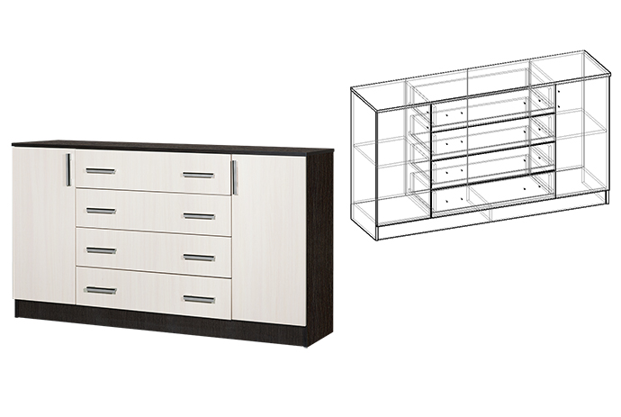 Комод комбинированный Светлана универсальное решение для вашей спальне. В нем можно разместить все, что угодно. Модель имеет 4 выдвижных ящика, а также две ниши с закрываемыми дверцами.