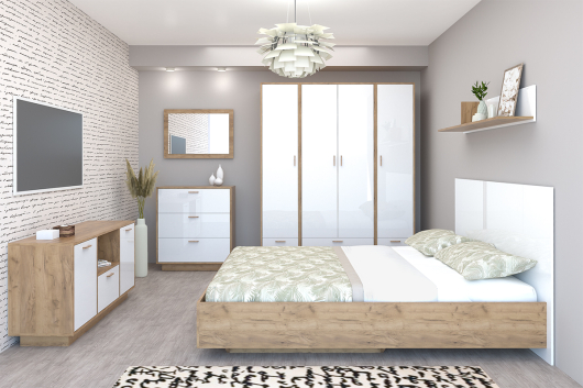 - кровать арт.031 с ЛДСП настилом - Ш1670 х Г2042 х В1000 мм.Спальня Эго (вариант 1) поможет обустроить уютную комнату, в которой вы сможете расслабиться и ощутить домашнее тепло. Кровать предоставит необычайно удобное спальное место, где вы после трудных и насыщенных дней сможете расслабиться, отдохнуть и набраться сил. Высокое изголовье позволит комфортно расположиться перед сном и почитать интересную книгу или посмотреть сериал на планшете. За двумя шкафа находится широкая штанга для вешалок-плечиков. Полки, скрытые за распашными дверьми пенала, и выдвижные ящики комода пригодятся для размещения сложенной одежды, постельного и нижнего белья, различных аксессуаров и коробок с обувью.