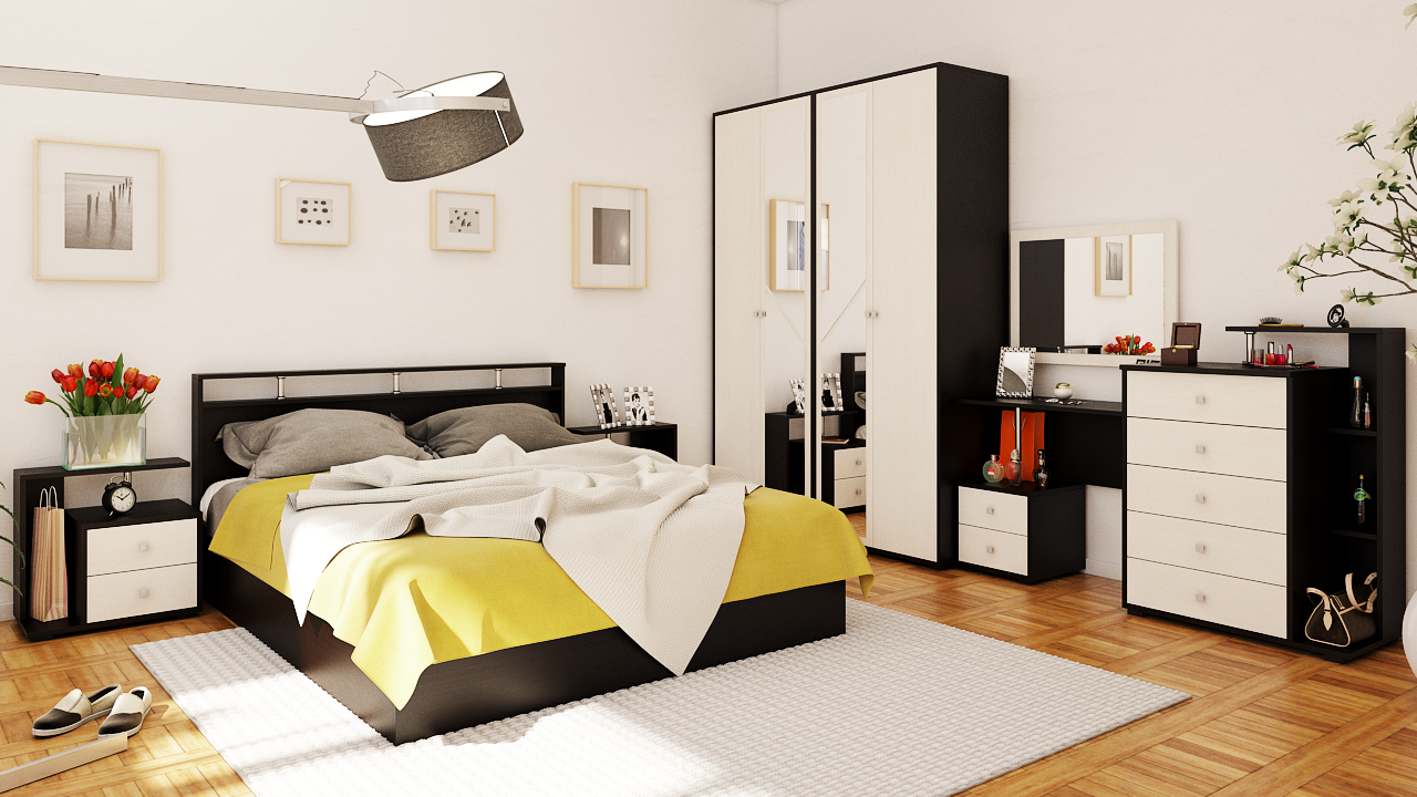 Спальня Камелия (вариант 3) поможет правильно и со вкусом обустроить самую любимую комнату в вашем доме. Кровать предоставит необычайно удобное спальное место, где вы после трудных и насыщенных дней сможете расслабиться, отдохнуть и набраться сил. Два вместительных выдвижных ящика прикроватной тумбы пригодятся для хранения разнообразных и необходимых предметов. На тумбах вы сможете разместить небольшой светильник и несколько красочных семейных фотографий. Одно отделение шкафа оборудовано штангой для вешалок-плечиков с двумя полками, второе предназначено для хранения сложенной одежды и белья, поскольку имеет четыре полки. Центральные дверки шкафа украшены зеркалами во всю высоту двери. Стол с зеркалом создают достаточно укромное место, где вы сможете спокойно нанести макияж, сделать красивую укладку и подобрать удачные украшения. Тумба с двумя выдвижными ящиками предназначена для хранения всей косметики и мелких аксессуаров. Мебель Камелия привлекает модными дизайнерскими идеями оформления комнаты для отдыха «души и тела», где будет легко и комфортно.